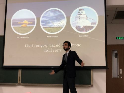 紧接着,十个学生团队依次进行了精彩的汇报展示。项目一的新型滴灌系统设计、项目二的行走能量收集装置设计、项目三的月台安全装卸系统设计、项目四的无人机货物传送系统设计、项目五的短距离智能交通工具设计,各具特色,精彩纷呈!同学们准备充分,汇报流利。Kamran在每组展示后均进行了针对性的点评。