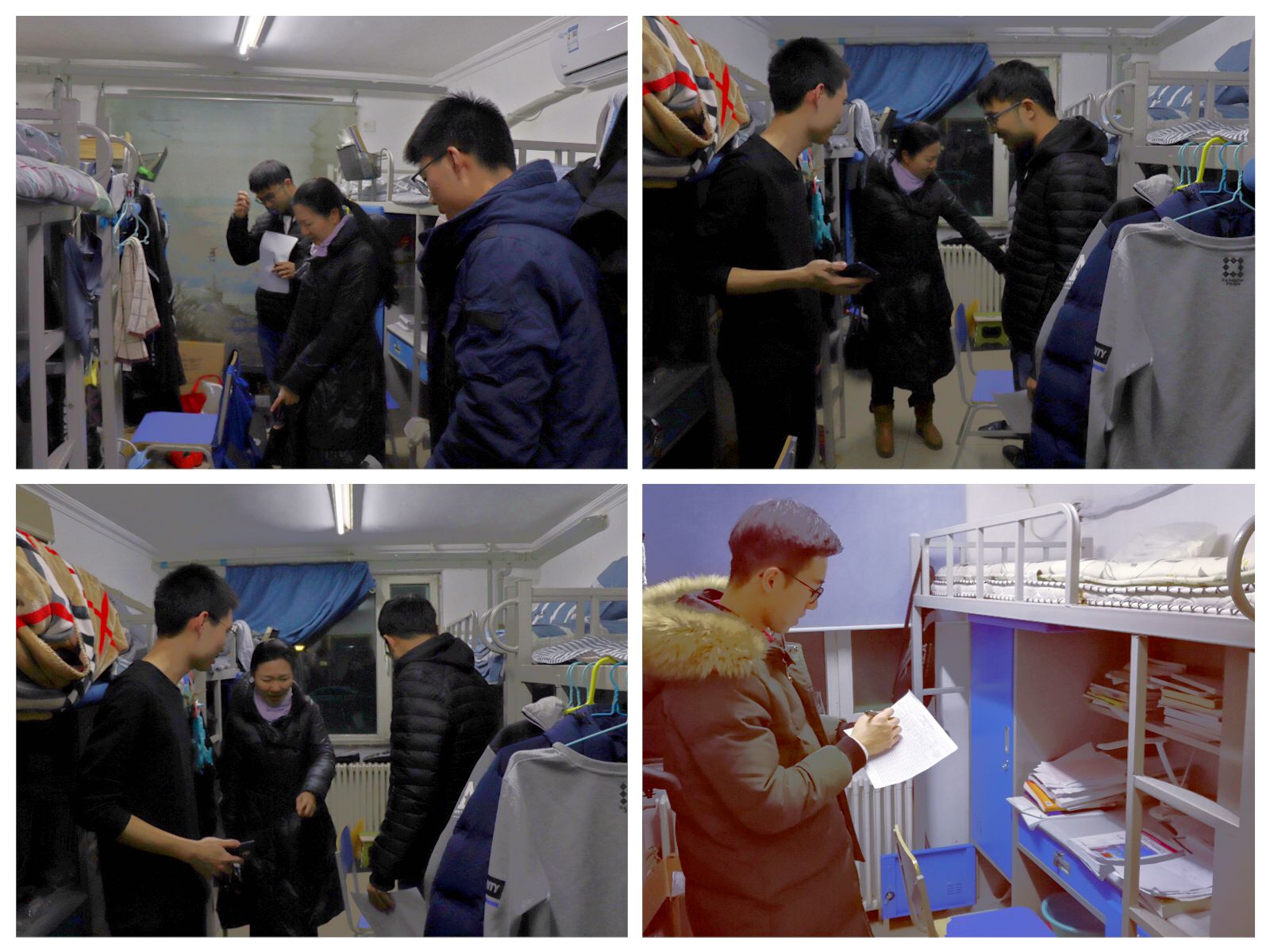 为进一步提高国通学院安全工作水平,保障学生住宿生活安全稳定,根据学校开展平安校园专项行动的要求,落实《关于开展校园安全隐患排查治理工作的通知》文件有关精神,我院于2018年12月22日、2018年12月29日多次深入宿舍,全面开展学生宿舍安全大检查。学生工作负责人赵秋迪,学生事务助理杨颖,2017级辅导员李超、周思齐,2018级学生辅导员孙博扬成立了学院学生宿舍安全检查小组,对全体学生宿舍进行安全隐患排查。