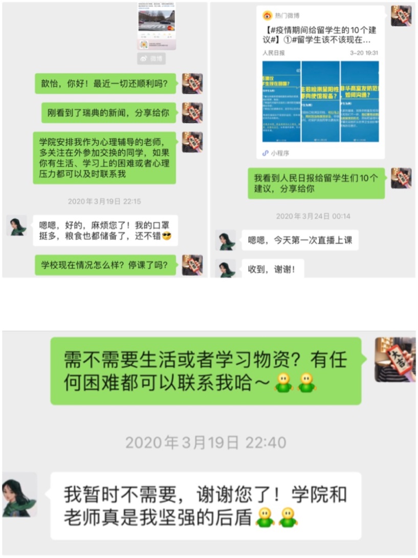 在密切关注境外学生健康和安全的同时,学院积极做好思想引导、心理疏导、答疑解惑等工作,重点对境外学生的思想、行为、学业、生活、疑惑困难等方面进行解答,第一时间邮寄防疫物资。向学生推送教育部组织编写的《海外留学人员新型冠状病毒肺炎防控指南》、“中国驻美国使馆邀请张文宏教授回答留学生、华侨华人抗疫问题在线直播”、人民日报《疫情期间给海外留学生的10个建议》等相关疫情防控及国家最新要求等信息与推送,将全院师生的关心关爱跨越千山万水第一时间送达学生心中。