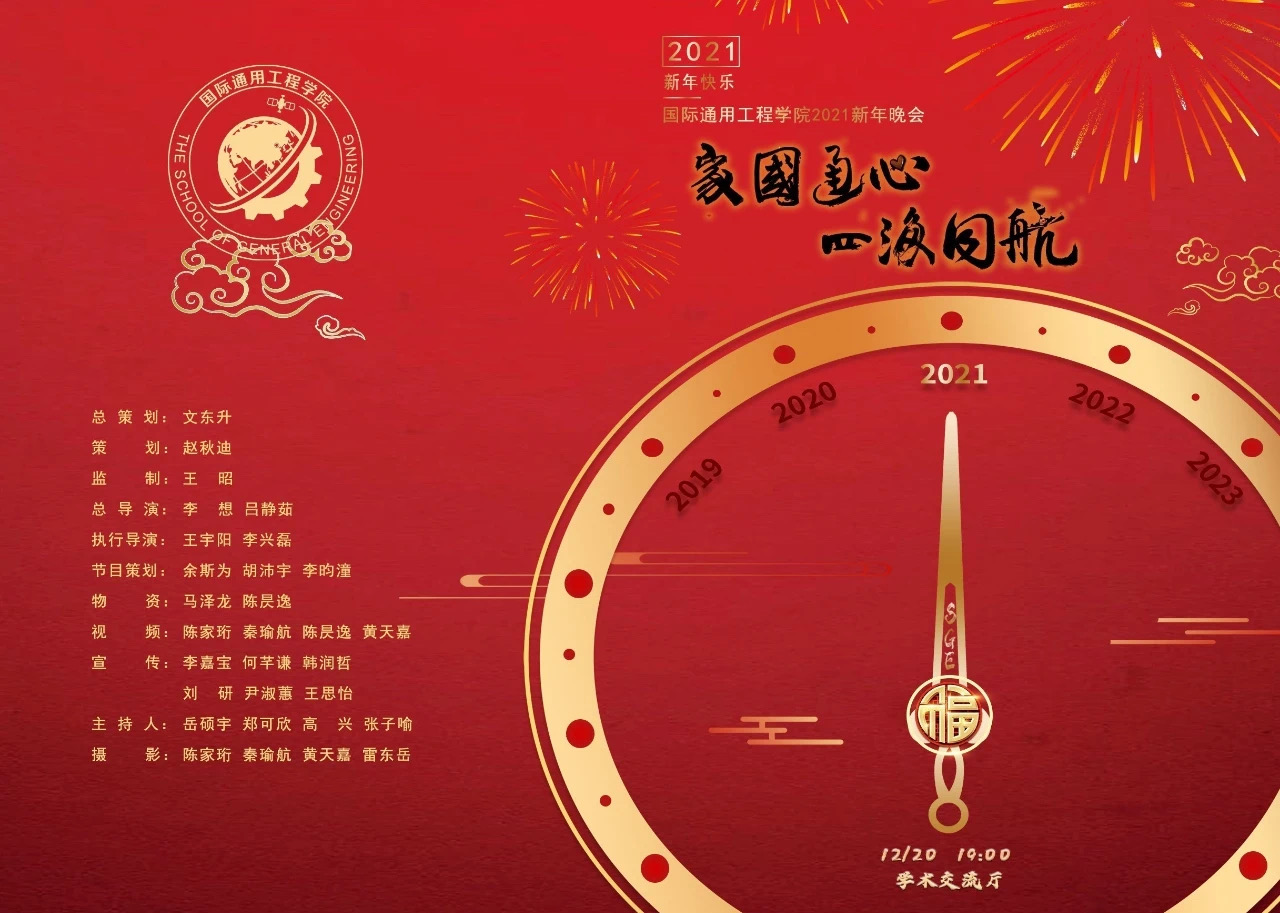 2020年是意义非凡的一年,在新年钟声即将敲响之际,国际通用工程学院成功举办“家国通心,四海同航”新年晚会,学院全体师生 共同回忆这不平凡的一年,满怀期盼与祝福携手迎接崭新的2021年。