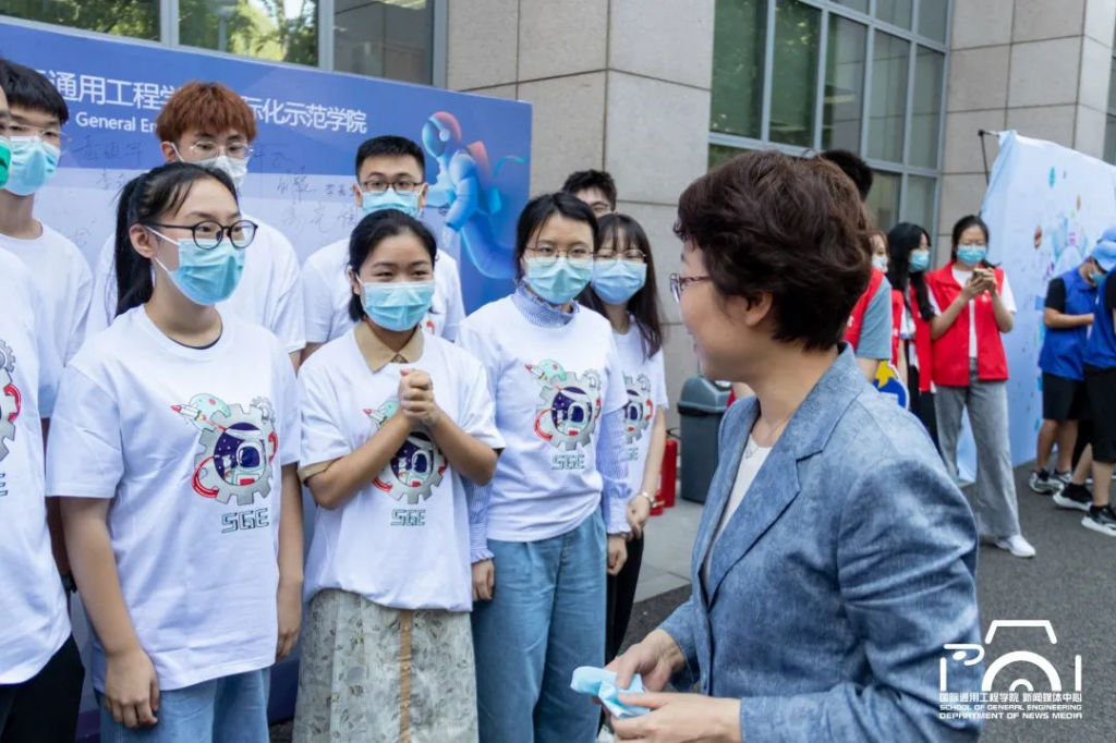 11点30分左右,校党委书记曹淑敏来到了国通学院迎新现场,向在场的国通新生和志愿者们亲切问好,校领导们的到来将迎新气氛推向了高潮。