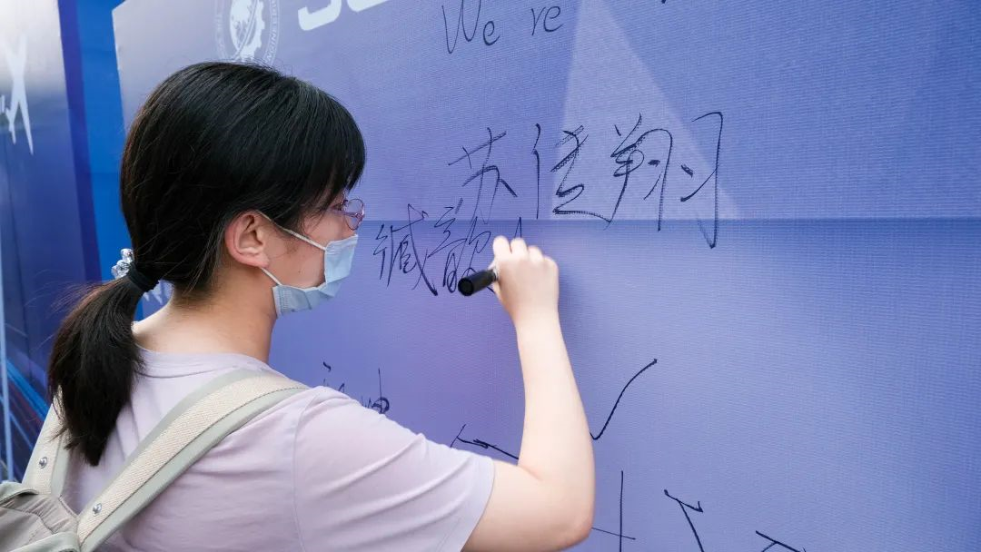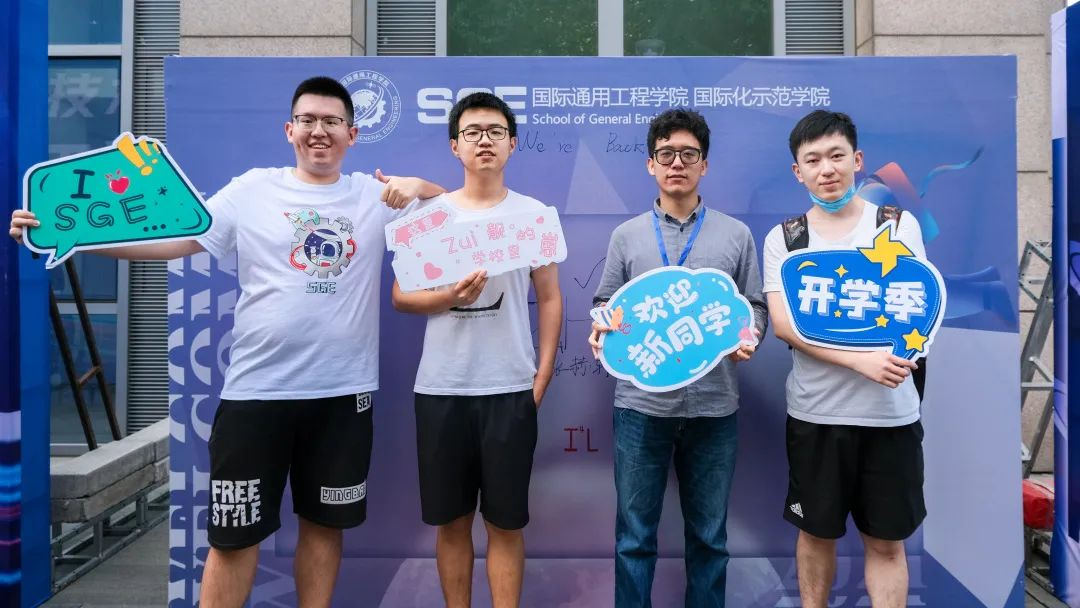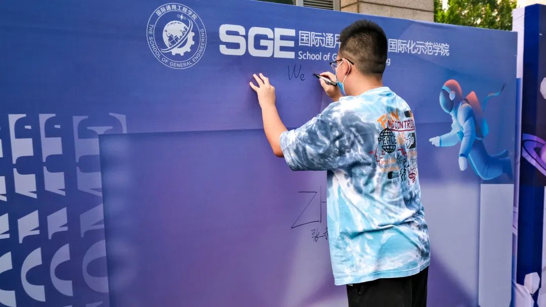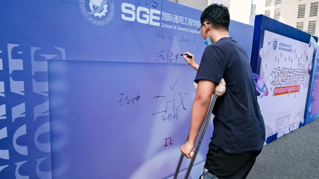 新生报到点旁,张赫轩同学在签名墙上写下了大大的“WE ARE BACK”。今年国际通用工程学院的研究生新生全部由本院本科毕业生组成。对他们来说,这不仅是一段新征程的开始,更是一份缘分的延续,一次温馨的回归。