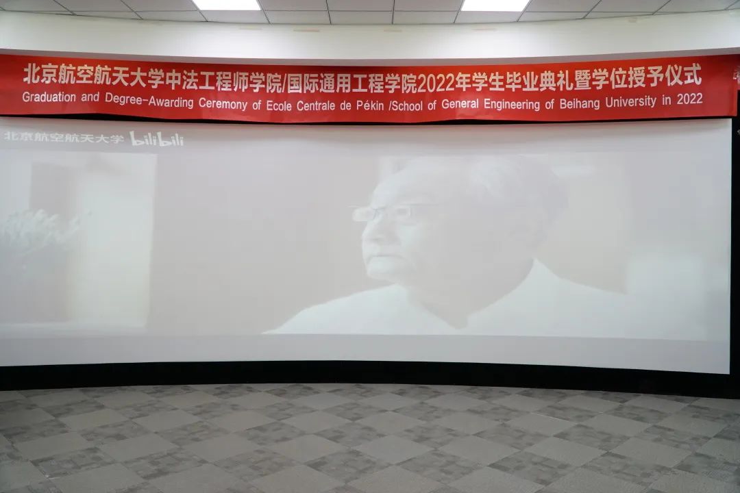 8时50分,出席典礼的领导老师与毕业生陆续入场就座,暖场视频《时空再相逢》、《正青春 共远航》循环播放,空天梦与校园情交织,营造了温馨的毕业氛围。9时整,学院毕业典礼分会场画面切换到晨兴音乐厅主会场,师生齐唱国歌后,毕业典礼正式开始。典礼上,王云鹏副校长宣读《北京亚洲成人在线一二三四五六区2022届毕业生学位授予决定》,中法工程师学院/国际通用工程学院共118人获学士学位,60人获硕士学位。党委副书记、纪委书记何新洲宣读北京市优秀毕业生名单,学院共11名同学获此荣誉。本科生毕业生代表丁纪昕、研究生毕业生代表陶仁帅、教师代表王自力院士、校友代表丁赤飚院士相继发言,校长徐惠彬院士讲话,表达了对毕业生的祝贺与期许,学院分会场掌声雷动,毕业生心潮澎湃、振奋激昂!