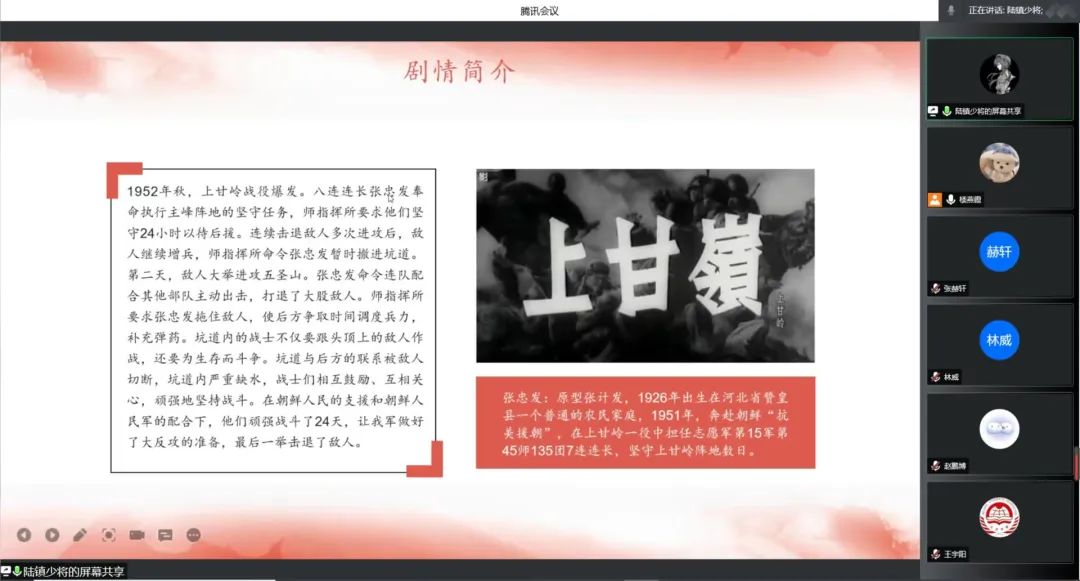 我院学生党支部开展了以“打卡红色经典,重温峥嵘岁月”为主题的红色电影以及书籍分享会。本次分享会由党支部各个学习小组的三名代表分享感悟,支部全体成员共同参与。岳俊辰、陈俊龙、栾贺云同志分别在会议上分享了《上甘岭》的电影片段和书籍《国家与革命》。