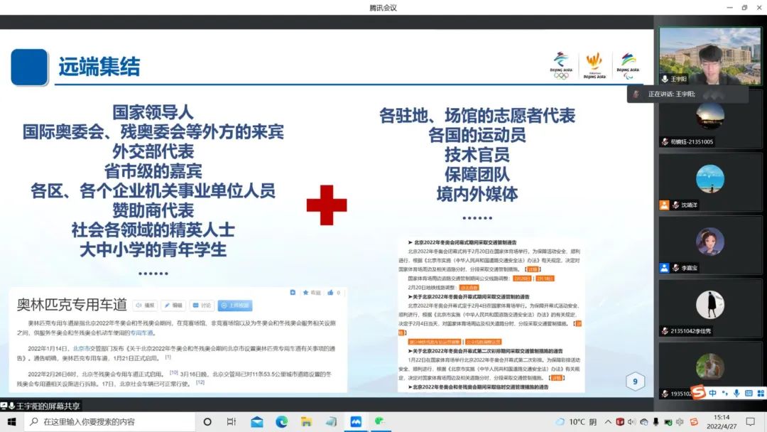 中法工程师学院/国际通用工程学院组织全体本研学生参与“弘扬冬奥精神,凝聚奋进力量”主题冬奥思政课。学生通过线上会议的方式聆听了王宇阳,秦瑜航,郑可欣三位冬奥会、冬残奥会志愿者的志愿经历。一段段精彩纷呈的冬奥分享,背后是一天又一天的付出和坚守。同学们在志愿者们的分享中,从台前走到幕后,更加深入地了解了他们的奉献、辛勤与坚持,更加深刻地理解了“一起向未来”的冬奥精神,更加深切地感受到了无私奉献这一志愿之魂以及冬奥中的美好人文关怀。