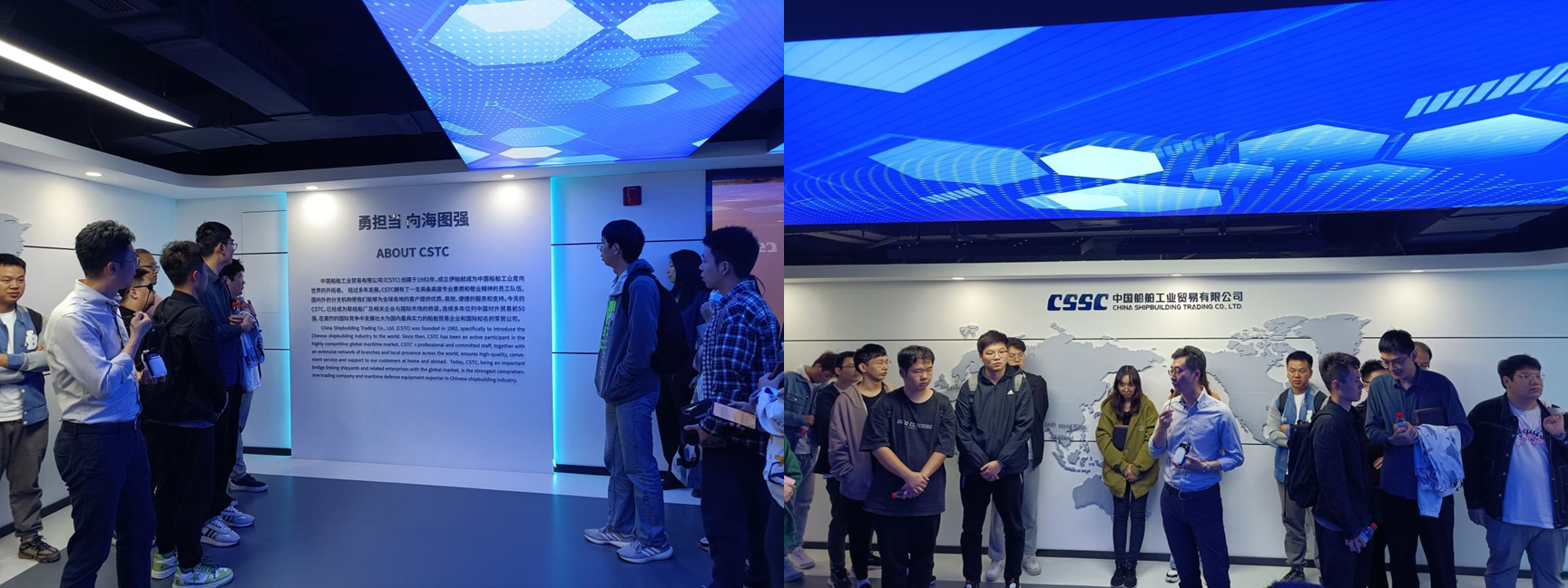交流会后,公司员工带领同学们参观了公司展厅,介绍公司的相关业务情况。同学们听得津津有味,热血沸腾,并对国家的船舶事业充满憧憬。最后,部分同学和公司招聘人员进行深度交流,进一步了解公司情况并投递简历。同学们表示深受鼓舞,对船舶事业和未来规划有了更清晰的认识,开阔了视野,明确了努力的方向。