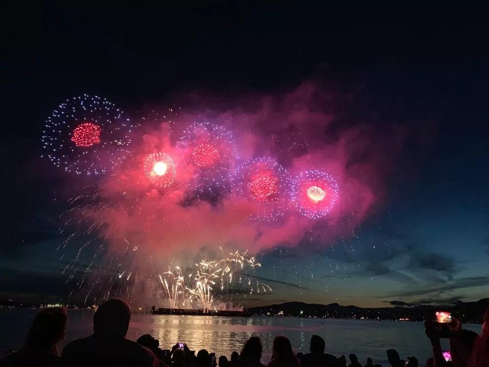 温哥华作为一个临海城市,海滩是城市中十分重要的部分。不论是UBC旁边的沉船海滩还是市区里的English Bay, 都是当地人在忙碌了一天后的好去处。实践小队十分幸运地赶上了当地的烟花节,作为当地最负盛名的离岸烟花表演,节日吸引了全城的人早早就去海滩上占位等待。