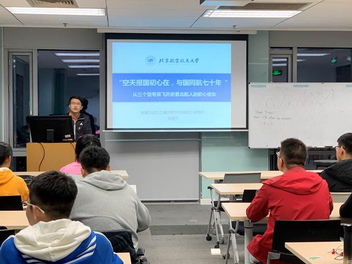 2019年11月6日,国际通用工程学院组织2019级学生开展学习日活动,此次活动,特邀请北航研究生宣讲团的张皓天,开展“‘空天报国初心在,与国同航七十年’——从三个型号首飞历史看北航人的初心使命”的主题讲座。