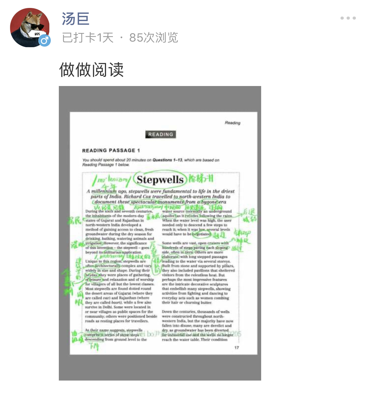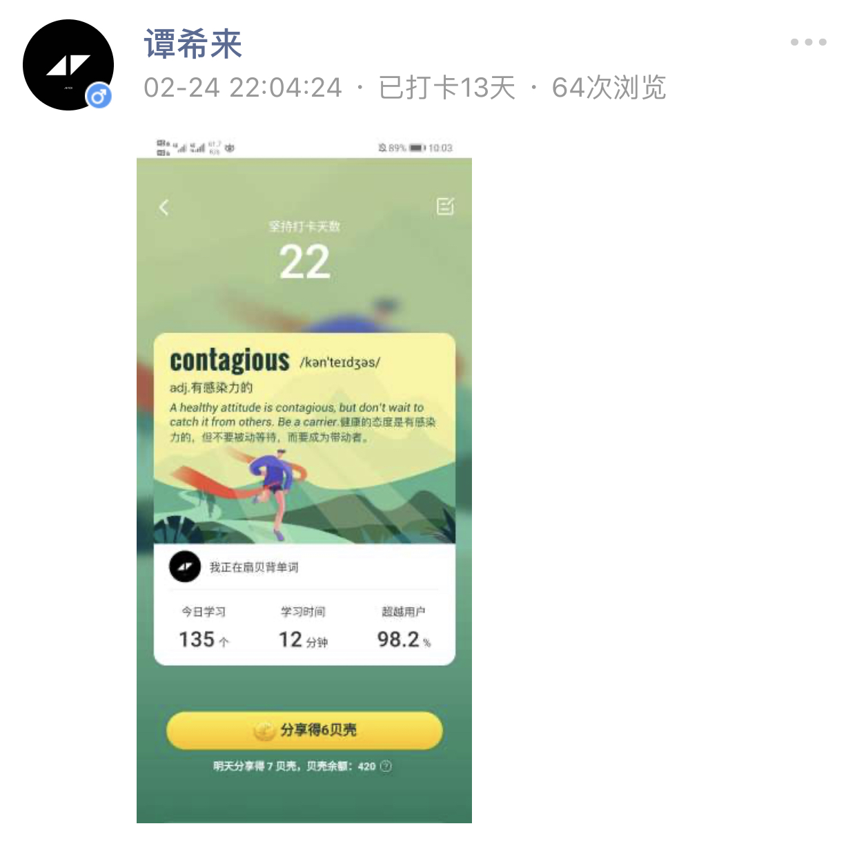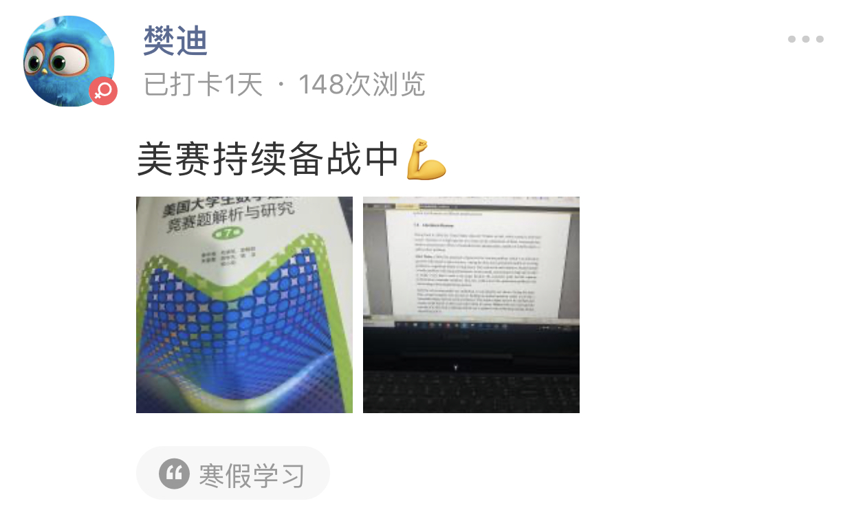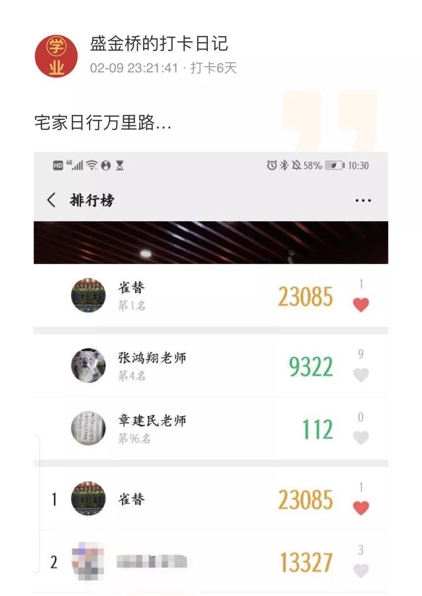为了丰富疫情期间同学们的生活,营造良好的集体氛围,国通学院学生会利用微信打卡小程序组织“在线打卡,战疫有你”活动,设计“寒假学习”“生活趣闻”和“健康生活”等板块,鼓励学生在家利用网络资源学习,加强体育锻炼提升免疫力。