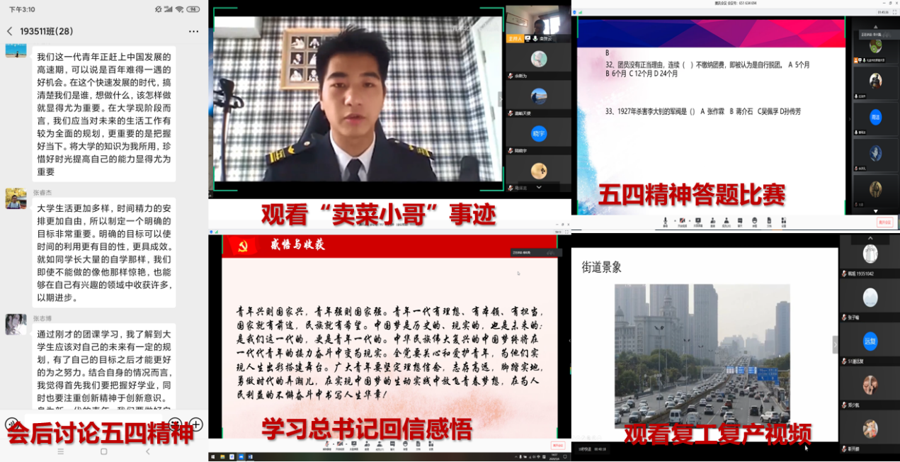 “青年一代有理想、有本领、有担当,国家就有前途,民族就有希望”,这是习总书记在给北京大学援鄂医疗队全体‘90’后党员的回信中,对新时代青年人的希望与寄托。其中,193511团支部邀请了马克思主义学院孙新老师与同学们共同学习回信内容。学习过后,同学们就五四精神在新时代的体现这一问题展开了激烈的讨论。183511团支部组织了一次五四青年节专题知识竞赛,学生们通过答题对五四精神有了更为深刻的认识。