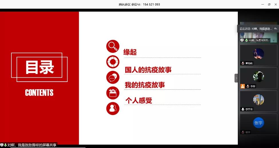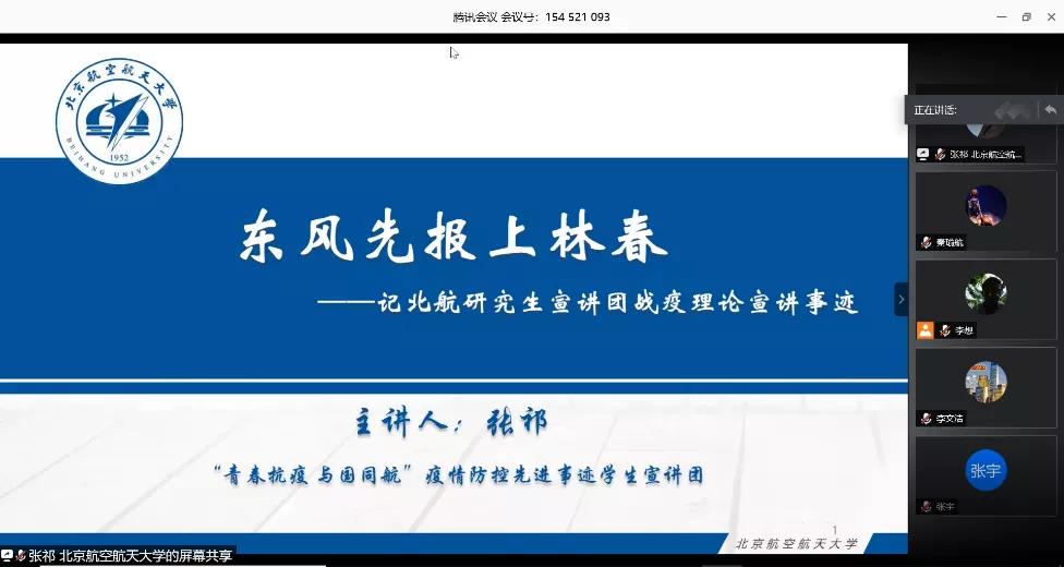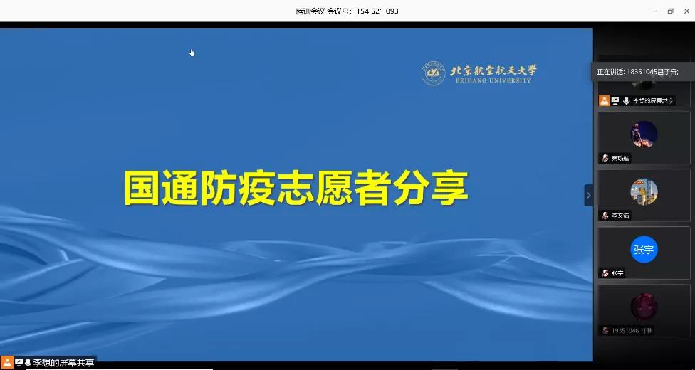 在聆听了宣讲团同学的分享后,8名来自不同年级的国通学院学生也讲述了自己的抗疫故事。吕子奇和王匡同学做了村镇出入口管控、来往车辆登记等相关值岗工作,事情虽小,但对基层防疫有着至关重要的作用。赵伊宁同学报名成为了一名线上教师,对即将高考的高三同学进行了一对一的英语辅导。张逸飞、董辰语、王宇阳同学积极响应北京市号召,参加了献血活动,为国家血库分担压力,“兢兢业业地做好力所能及的事,便是平凡而伟大的人”,王宇阳同学呼吁大家做好每一件小事,传递正能量。唐靖洋同学积极参与小区捐款捐物,盛金桥同学参与了北航科研战疫的宣传工作,她被北航人顽强的拼搏精神感动,更加坚定了科研报国的决心。