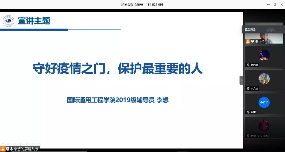 5月13日下午,“青春抗疫,与国同航”疫情防控先进事迹学生宣讲团受邀在国际通用工程学院进行宣讲,宣讲人分别为:经济管理学院的吴祁颖、化学学院的潘思琦、材料科学与工程学院的张祁以及国际通用工程学院辅导员李想,四位宣讲人分别介绍了他们在抗疫中所做的工作,分享了心得体会。学院组织全体学生线上聆听学习他们的事迹,并与他们进行了交流。本次活动由19级辅导员李想主持。