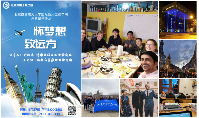 国际通用工程学院本周组织开展“怀梦想,致远方”主题的启航留学沙龙活动,通过网络会议平台的形式邀请学院有交换经历的两名同学分享在德国亚琛工业大学和瑞典乌普萨拉大学交换期间的留学故事。两位同学从校园环境、学习氛围、师资力量、教学特点以及文化交流分享自己的留学经历。也分享了通过参加宿舍文化活动、当地居民的聚会,加入北航校友会等方式,快速融入当地生活的过程。两位同学也都强调了传播中国文化的重要性,在促进两国文化交流方面,要努力贡献积极的力量,怀揣留学梦想,讲好中国故事。
