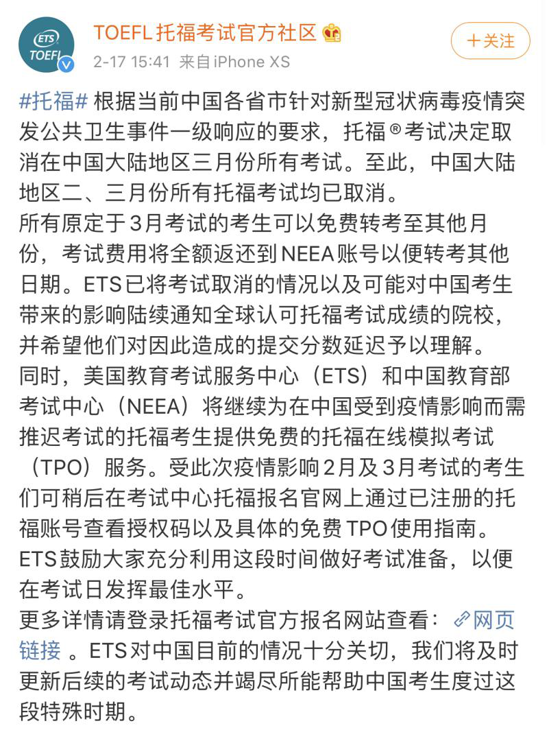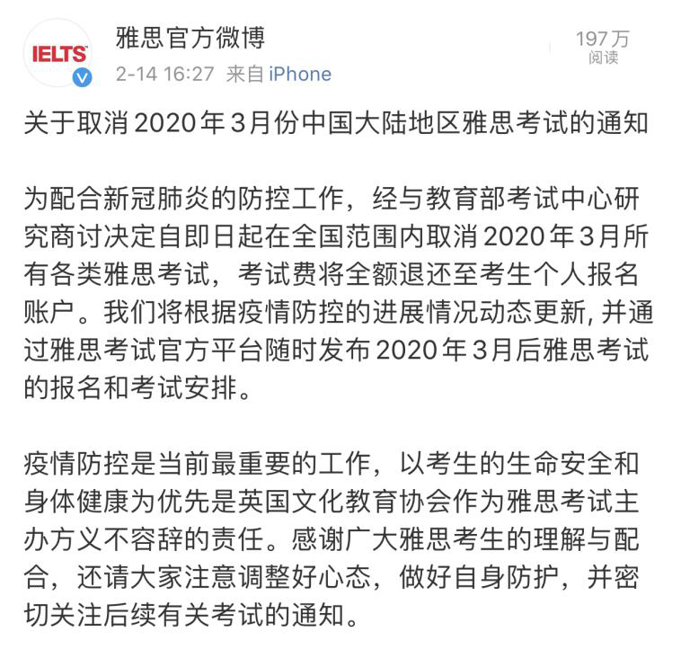 近期,雅思和托福官方微博先后宣布,为配合新冠肺炎防控,取消3月份中国大陆地区所有考试!至此,中国大陆地区2月和3月所有雅思、托福考试均已取消。