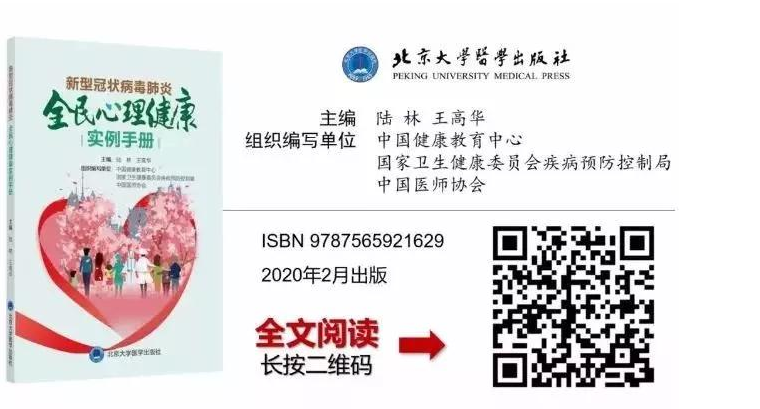 由北京大学第六医院陆林院士、武汉大学人民医院王高华院长主编,中国健康教育中心、国家卫生健康委员会疾病预防控制局、中国医师协会组织编写的《新型冠状病毒肺炎全民心理健康实例手册》由北京大学医学出版社正式出版,内容全面、系统,理论与实例相结合,满足疫情下不同民众群体的需求,给予权威心理防护与应对指导。
